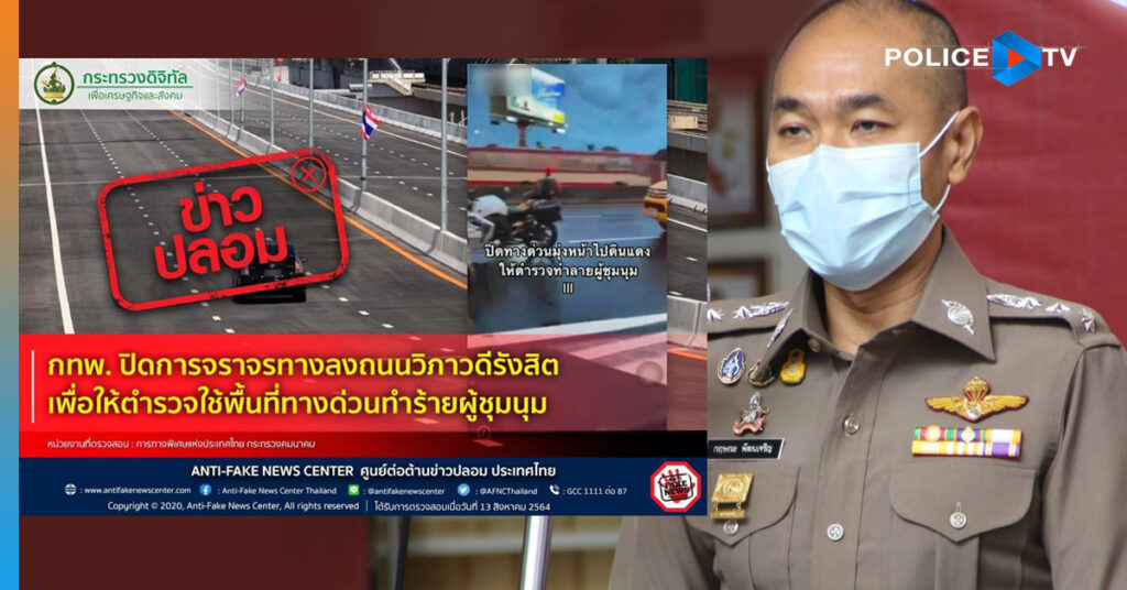 กรณี กทพ. ปิดการจราจรทางลงถนนวิภาวดีรังสิต เพื่อให้ตำรวจใช้พื้นที่ทางด่วนทำร้ายผู้ชุมนุม นั้น ทางศูนย์ต่อต้านข่าวปลอมประเทศไทย กระทรวงดิจิทัลเพื่อเศรษฐกิจและสังคม ได้ตรวจสอบกับ การทางพิเศษแห่งประเทศไทย กระทรวงคมนาคม ยืนยันว่าเป็นข่าวปลอม