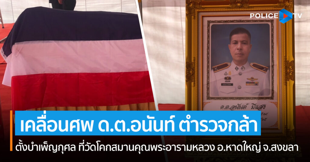 เมื่อเวลา 08.00 น. วันนี้(11มี.ค.65) ธงชาติไทยคลุมรับศพตำรวจกล้า ดาบตำรวจ อนันต์ มีแสง ที่เสียชีวิต จากเหตุปิดล้อมจับกุมคนร้าย ที่ ต.โคกม่วง อ.เขาชัยสน จ.พัทลุง เมื่อวันที่ 9 มีนาคม 2565 ถูกเคลื่อนย้ายออกจากโรงพยาบาลสงขลานครินทร์ โดยมีขบวนรถนำ จากตำรวจกองปราบ / รถตำรวจทางหลวง และรถตำรวจ ของ สภ.หาดใหญ่ นำขบวนตลอดเส้นทาง เพื่อมาบำเพ็ญกุศล ที่วัดโคกสมานคุณ พระอารามหลวง อ.หาดใหญ่ จ.สงขลา ท่ามกลางความโศกเศร้าอาลัยของครอบครัวและญาติพี่น้อง