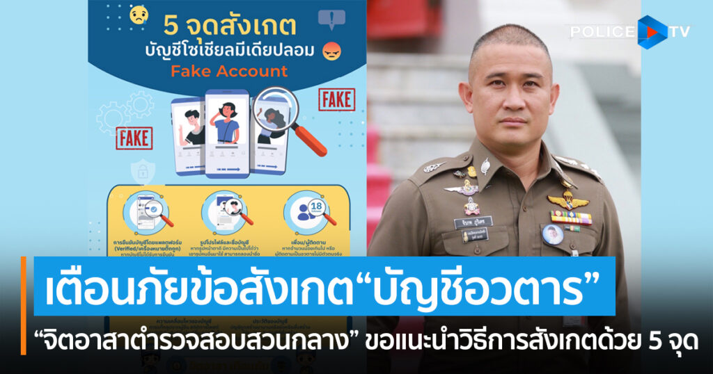 “จิตอาสาตำรวจสอบสวนกลาง” ขอแนะนำวิธีการสังเกตด้วย 5 จุดสังเกตบื้องต้น ที่จะทำให้ทราบว่า เป็นบัญชีผู้ใช้งานสื่อสังคมออนไลน์ปลอมหรือบัญชีอวตาร เพื่อหลีกเลี่ยงและป้องกันไม่ให้ตกเป็นเหยื่ออาชญากรรมออนไลน์จากบัญชีผู้ใช้งานสื่อสังคมออนไลน์ปลอม ดังนี้
